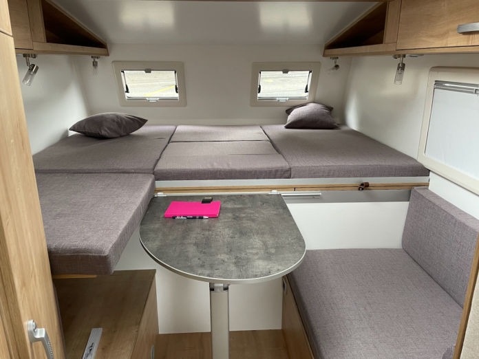 Das elegante, hochwertige Interieur mit grosszügiger Dusche, Schiebewaschbecken, Trenntoilette, und den Längsbetten mit jeweils zwei Metern Liegefläche bringen Komfort und Gemütlichkeit.